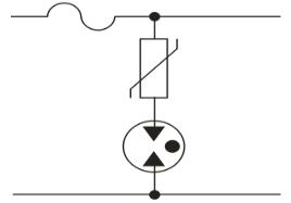下圖為電源口典型的三加一電路,三顆壓敏加一顆氣體放電管: